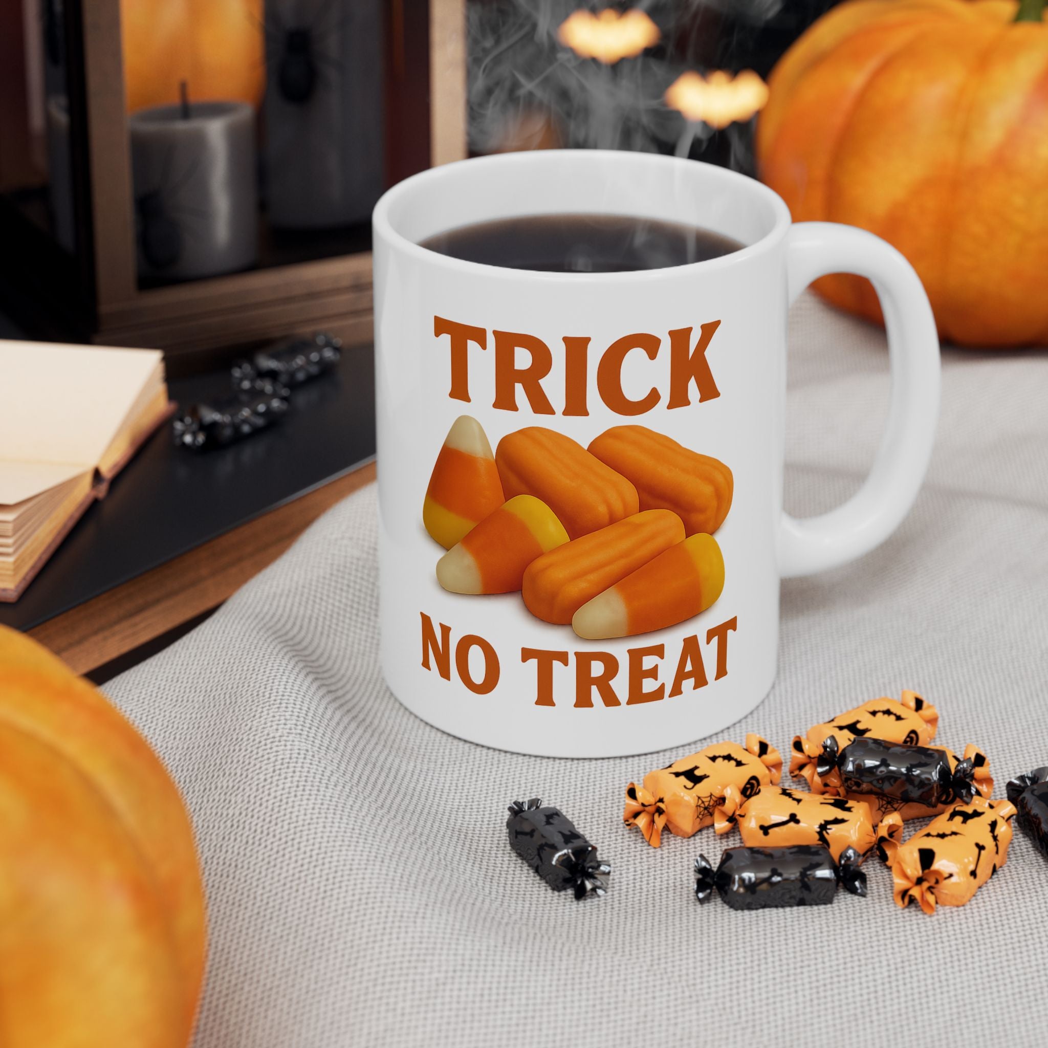 Trick No Treat, Candy Corn, Circus Peanut Candy Coffee Mug - Halloween Coffee Cup, Perfect Gift for Halloween Lovers, Fun Gift for Friends -